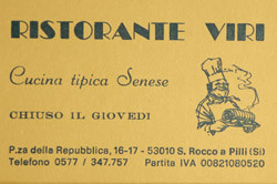 ※註:附圖是張Ristorante Viri餐廳的名片, 其上註明了此餐廳是「道地的西耶那料理 Cucina Tipica Senese」且「每週四休息CHIUSO IL GIOVEDI」