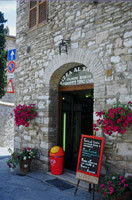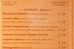 現在該輪到進餐廳吃飯了。首先一定要知道餐廳在各個時段開門迎客的時間,午餐通常是12:30左右,而晚餐一般是晚間7:30左右才開門。到得太早,會吃閉門羹的。還有,在鄉間或是小鎮上那些家庭式經營的小餐廳,一週當中必有一天是他們的休息日,在城市裡通常選週日打烊,但像我們非常喜愛的,位在 S. Rocco a Pilli 的小餐廳 Ristorante Viri,它就選週四作為休息日。這些每日的open hour及close day通常會公佈在店門口或註明在該餐廳的名片上,一般的旅遊指南上也都會註明這些訊息。別忽略這些小細節,否則好不容易打老遠地驅車去到某個好心人推薦的餐廳,當下才發現該日不作生意,豈不掃興?