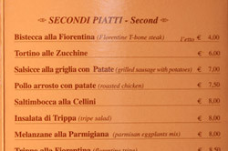 Secondi (第二道主菜):在這就有各式各樣的肉類,若近海邊的地區,魚肉、海鮮也在此項目下。此道菜通常會輔以下一個單元Contori(配菜),因此蔬菜類不會出現在此單元內,但在香菇盛產的季節裡,在托斯卡納負有盛名的架烤牛菌菇 (grilled Porcini)是一道主菜而也會列在此項目之下。在托斯卡納菜單上常見的肉類有,Pollo雞肉,Anatra 鴨肉,Coniglio 兔肉,Vitello小牛肉,Agnello小羊肉,等等五花八門,還有不少的野味,例如Cingliale野豬肉,Fagiano雉雞,等,再加上各式肉類的部份及種種不同的烹調方法,喝!要搞懂菜單的內容可真是一大難題,無怪乎每次我們都要弄上大半天才能搞定要點什麼,好在小店老板們都深知他們的義大利料理博大精深,值得這些外國人慢慢研究,不來催你。
