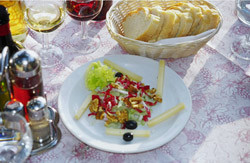 菜是怎麼上的呢?麵包 (pane)可能早就擱在餐桌上或在你就座時就端上來,而一包包酥脆細長的麵包條(Grissini),像沒塗上巧克力的波吉棒,也是現成放在桌上的。礦泉水及酒是你叫了之後立刻就送來,若你有叫前菜,它到的也很快,但前菜與第一道菜之間,及第一道與第二道之間就要等上一段時間了,畢竟精緻的菜餚需要時間準備。晚上對我而言用餐是「唯一的大事」,在餐桌上一邊啜著酒,一邊與同伴細數著今天的收穫,旅途上永遠有笑談不完的趣事。
