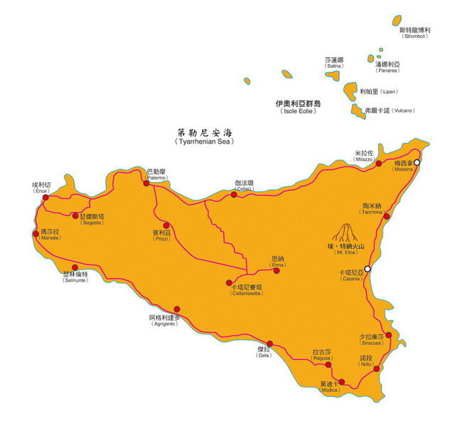 西西里之旅,紅線標示我的旅遊路線和我所經過的城市