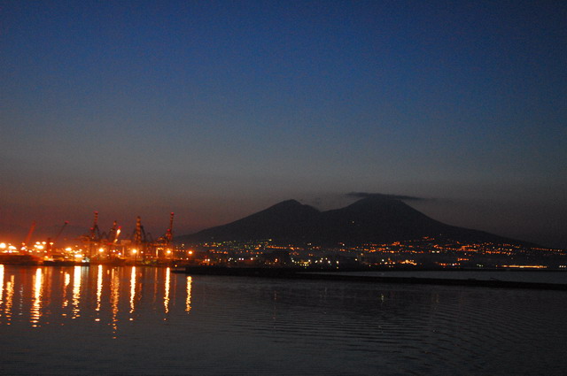 第二天,天還沒亮,我們就抵達了義大利,緩緩進入拿波里港,遠處的維蘇威火山在望。