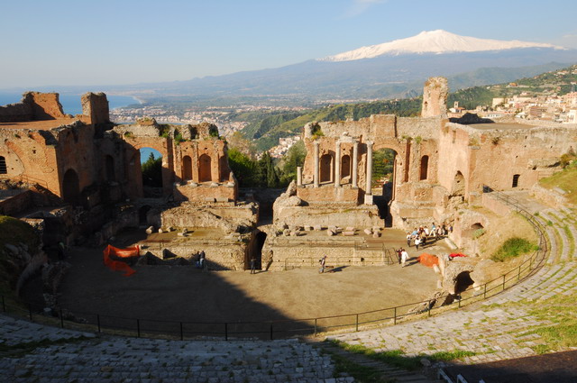 隔日再去,果然不失眾望,這才是我所期望的景色。從古老殘缺的劇場望出去,有美麗的海岸線,在陽光下閃閃發亮的蔚藍海洋,還有那直叫人移不開視線的埃特納火山。