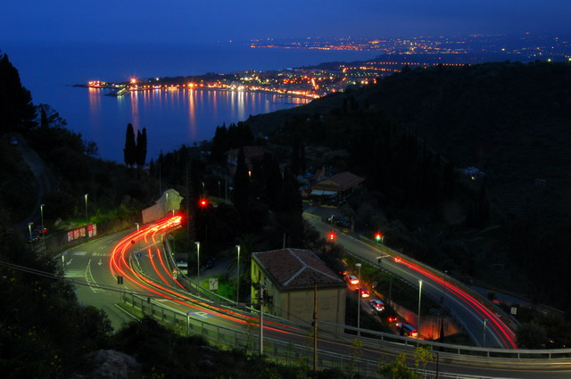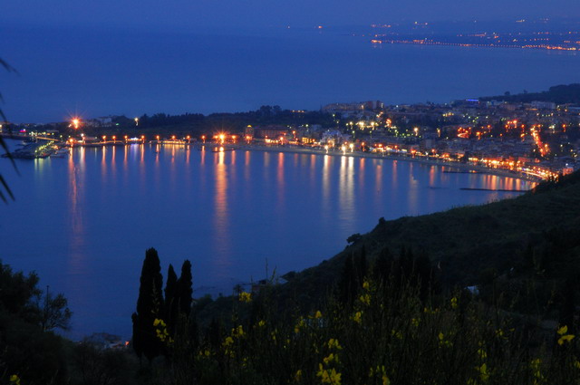 暮色裡,山腳下的納克索斯花園和其他的沿海城市無一不是萬家燈火、璀璨無比。它們似乎正用一長串的街燈來勾勒西西里的海岸。