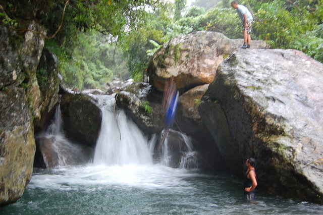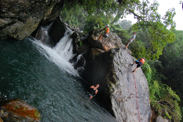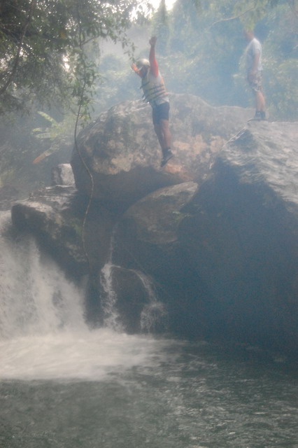Eric 一馬當先躍入水中,Arthur 次之,正站在岩頂上準備。