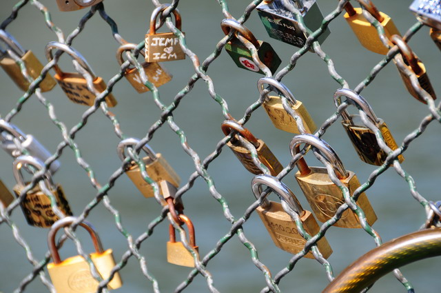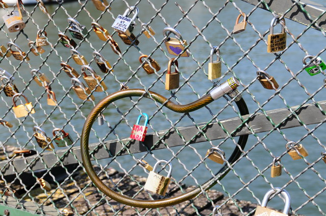 藝術橋還有一個有趣的景觀,橋的護欄上掛滿戀人們在此鎖上的“訂情鎖”:寫上兩人的名字,再掛上、鎖上,兩人一生的愛情從此牢牢上鎖。