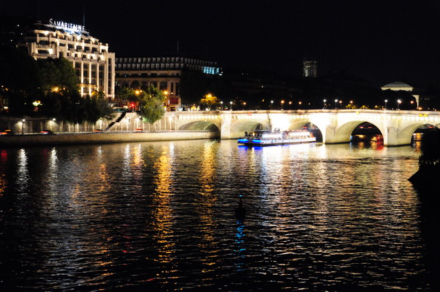 從藝術橋望過去,一艘載著遊客遊河的蒼蠅船,正準備穿過塞納河上著名的新橋 Pont Neuf。