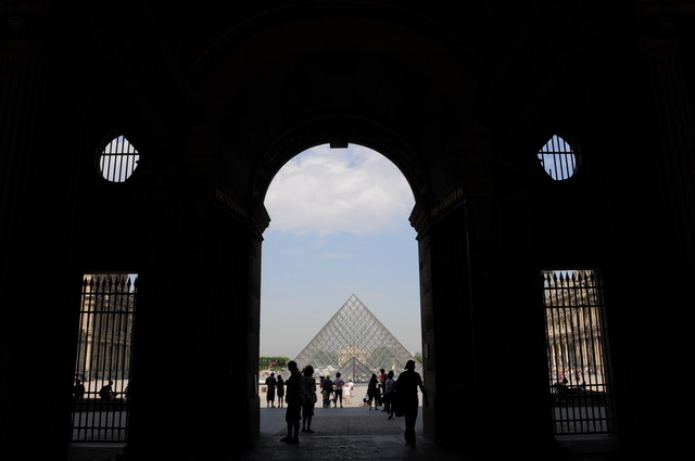 從方形廣場進入拿破崙中庭,穿過拱門,玻璃金字塔隱隱在望。
