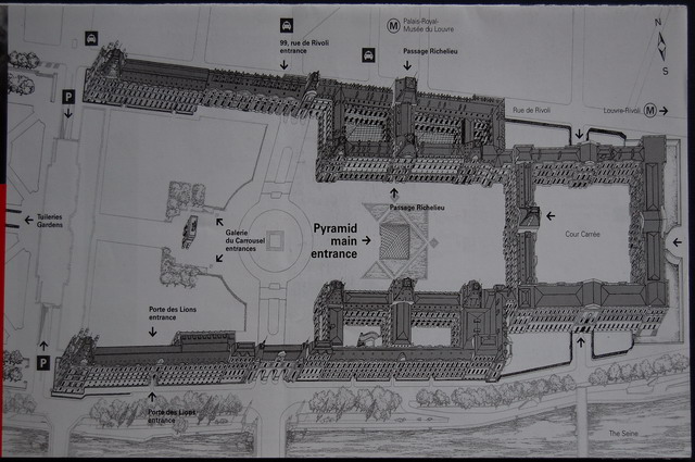 羅浮宮的規模非同小可,就像個大觀園,內部豐富的收藏多到令人眼花撩亂,所有的典藏可分為古代中東文物、古埃及文物、古代希臘與伊特魯利亞與古羅馬文物、伊斯蘭文物、亞非大洋洲藝術、繪畫、雕塑、工藝品、印刷與素描,若再加上“羅浮宮的歷史與中世紀的羅浮宮” 洋洋灑灑就有十大類,數量多達40萬件,分別陳列於德儂館(Denon)、蘇利館(Sully)、希塞利奧館(Richelieu)三座館,而每一展館又有4個樓面。聽人說,若要認真地走完每一展館的每一層樓的每一個展間,可得走上八公里之遙。