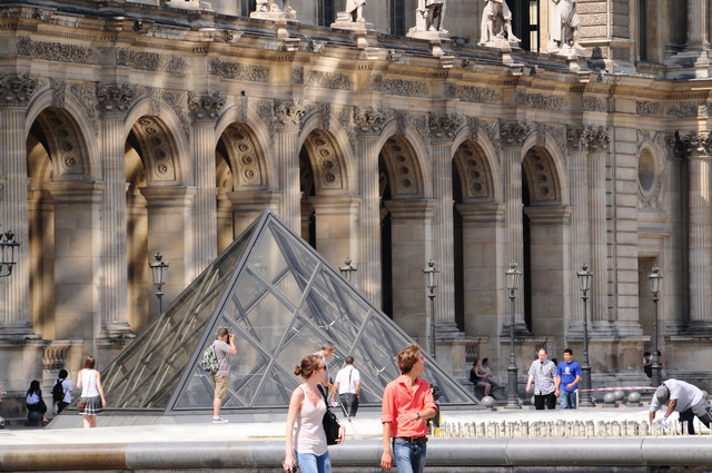 走進方形中庭,面對端正堂皇的古典主義立面,突然警醒:不要急就章的就匆匆走進玻璃金字塔內。我將買票排隊之事暫交付給麗真和柏軒兩人,我則趕去環視這精彩的建築外觀。仔細推敲羅浮宮大肆整修興建的年代,它該屬於巴洛克式而非我手上旅遊指南所指稱的新古典主義建築。眾人的目光全集中在由貝聿銘所設計的玻璃金字塔,拿破崙中庭的華麗已鮮有人凝視,但兩者之間:古典與現代,則相互輝映亦呈現出兼容並蓄的美感。雖然只有十幾分鐘的駐足,但我確信羅浮宮建築精彩的程度應該不亞於內部的典藏。