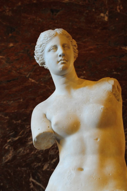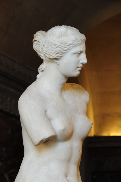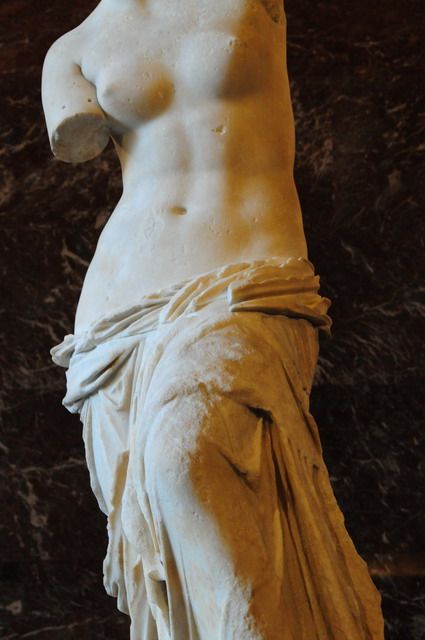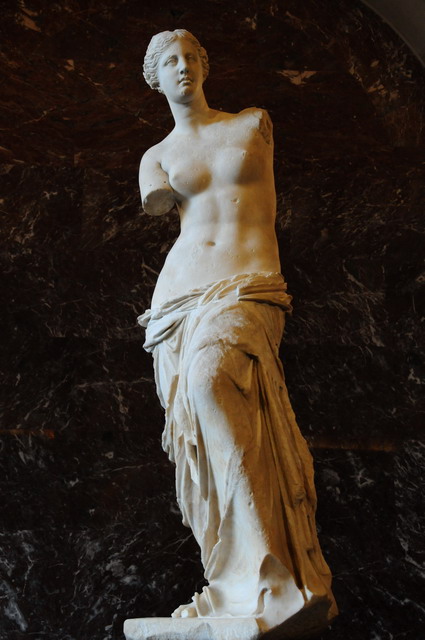 該輪到主角了:Vénus de Milo米洛的愛芙羅蒂黛,也稱斷臂的愛芙羅蒂黛(維納斯)。202公分高的大理石雕像,是西元前二世紀的作品,在1820年被愛琴海南部的米洛島上的一名農夫所發現。