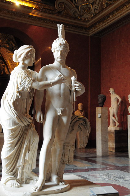 走進這空間,眼下盡是希臘諸神和羅馬帝王的雕像,不禁走向每一座雕像,暫且不去看旁邊的立牌說明,我總想先考考自己的判斷力,猜猜這雕像是誰。在這展廳內,各個神祇常因不同的年代、不同的作者而同時存在好幾個,除了容貌不同之外其姿態也多變,其中不乏雅典娜、希拉、阿波羅等著名的神,但我的目光總是逗留在如月神雅特彌絲(Artémis,羅馬神話中的戴安娜)或愛神愛芙羅蒂黛(Aphrodite,羅馬神話中的維納斯)等這些美麗的女性雕像前,尤其是每一個愛芙羅蒂黛都讓我凝視甚久,她可是我青澀少年時心目中僅有的愛與美的象徵。