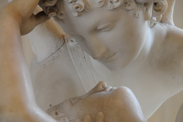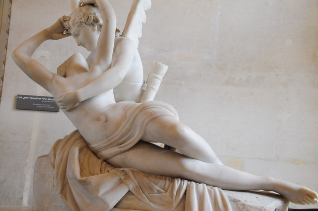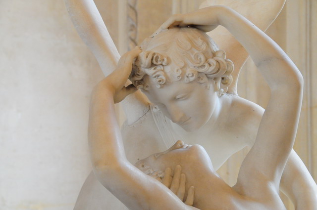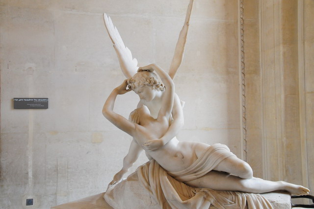 跨入德儂館,來到一展廳,突見一座美麗的雕像,大人小孩無不驚呼連連,我也屏住呼吸久久無法把目光移開。看了說明才知這是安東尼奧.卡諾瓦(Antonio Canova)的 Psyché ranimée par le baiser de l’Amour(因愛的吻而甦醒的賽姬)。初見之時,完全不知道此雕像背後的故事,只覺得此雕像無比的細緻、柔美,少男少女青澀的情愛表露淋漓,令人愛不釋手。回台之後趕快谷哥一番,才略知一、二,原來這是一則嫉妒心和好奇心糾纏的愛情故事: