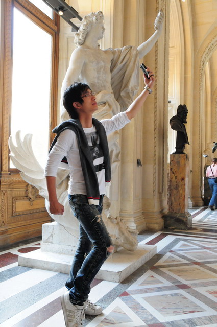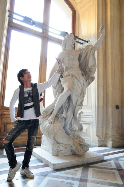 這當然是個玩笑,頑皮的柏軒在雕塑館中看見此一巴洛克風格的雕像,一時玩心大作,拿出口袋中的 iphone 來和它比劃、比劃,看是誰比較酷,這舉動逗得不少一旁的參觀者嘻笑不已。