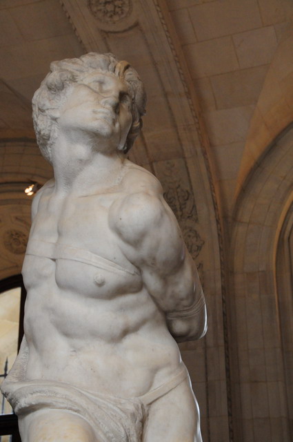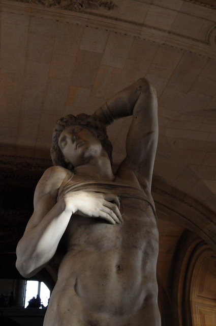 「垂死的奴隸」以及「被綑綁的奴隸」這兩尊雕像是陵寢設計的一部份,完成於1513年,後來不知如何竟輾轉地被法國國王法蘭西斯一世帶到法國來,命名為「奴隸」。眼前,在這個筋疲力竭與順從命運的姿態裡,及在這個終要從生命的奮鬥中得到鬆懈解放的最後一刻時,究竟包涵了米開朗基羅什麼樣的心境轉變?此刻,即使我站在雕像面前再久,我也無法看透。這兩尊「奴隸」以及另外四尊以「囚」為名的人物石雕一直是世人難以理解的謎。