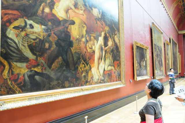繪畫館的一角。羅浮宮裡並不禁止拍照,不論是雕刻或繪畫,至少我本人沒受到任何的限制和禁止。我同時也看到很多人用閃光燈對著油畫拍照,我心裡納悶,為何有許多博物館三令五申禁止參觀者使用閃光燈,說是會損毀畫作,但羅浮宮為何如此大方呢?