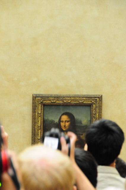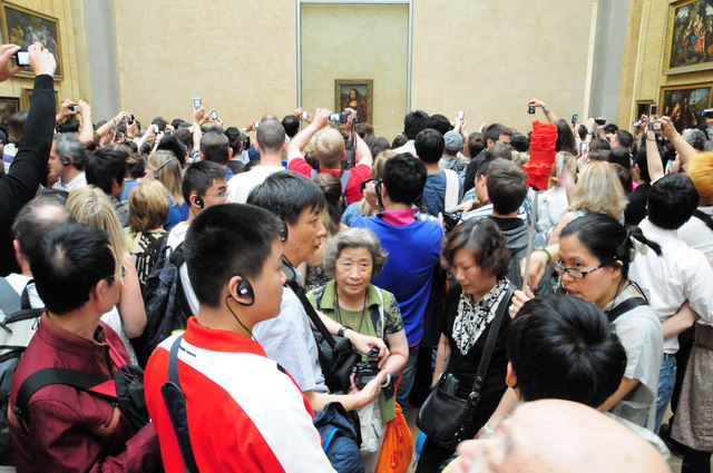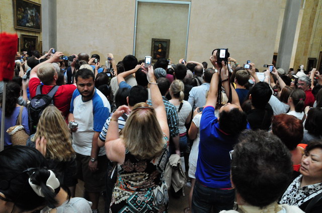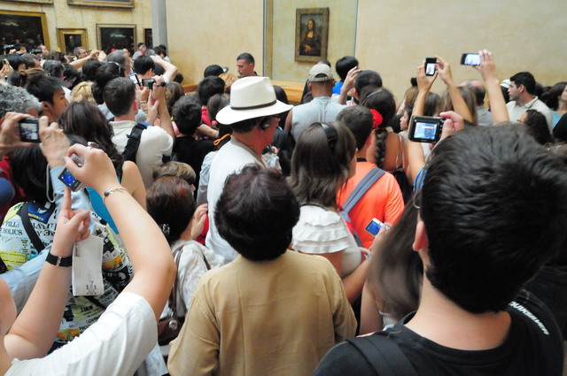 觀光客愛死了蒙娜麗莎。照這狀況來看,我想我是擠不到前面,別想與她面對面作近距離的接觸。我只有高舉相機,盲目的朝著蒙娜麗莎連續按下好幾次快門,勉強拍到畫作本身,但真正引發我拍照動機的是擠在我前面的那一大群,同我一樣可笑,都高舉著手機、相機的觀光客。