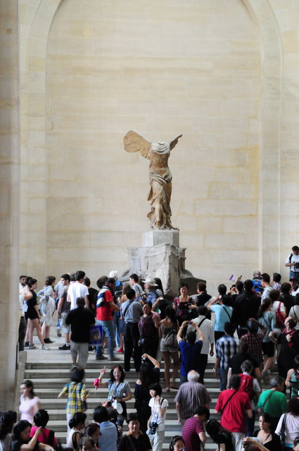 我在雕像對面樓的樓梯欄杆邊上找了一個有利的位置,可以居高臨下俯視雕像。靠著欄杆我從容不迫的舉起相機,構圖、對焦,然而就在此刻樓梯口突然湧進一大群聒噪不堪的大陸觀光客,將我從三邊團團圍住,由於那裡的地點好、視野佳,他們就都停在那不走了!一群人在我身旁身後七嘴八舌、評頭論足。聲音紛雜,沒關係,若是聽不懂的語言我幾乎可以充耳不聞,或者,若是柔軟的英、法語我可以當它作大廳裡的背景音樂,偏偏這群人的語言我懂,這樣我就躲避不掉被騷擾的困窘了。突然!我聽到一個年青男子的聲音,他說:「…這館(指羅浮宮)就像傷兵院一樣,你若沒斷隻手、或斷隻腳就甭想住進來…。」我聽了,看看鏡頭裡的勝利女神,再回想一下這一路來所看到的殘缺不齊的許多古蹟雕像,這話似乎沒錯,但這比方也太突兀了些,不是嗎?