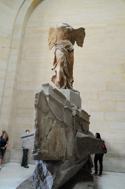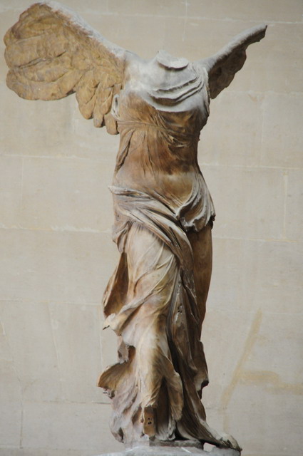蔣勳先生說:「希臘古代信仰勝利女神,也就是希臘文中的「Nike」。通常,在海戰中勝利的一方,為了凱旋紀念,會雕一座勝利女神像。希臘人也相信戰爭的勝利歸屬於Nike女神保佑的一方,並且展開雙翼,飛臨勝利者戰船的上方,輕輕落在船頭。這一件傑作正是在表現勝利女神飛揚並要落在船頭的那一剎那。」呀~~~!這是多麼美的形象,我在心底如此呼喊著。瞧她站立的姿勢,可以想像,她面迎著海風,從天上降臨在一艘船的船頭,從緊貼著身子的衣袍可知,海風是強勁的,雖看不到雙手,但我想女神此時必定是敞開心胸與雙手,迎向癱軟疲憊的勝利者,臉上流露著讚許與鼓勵的神情。