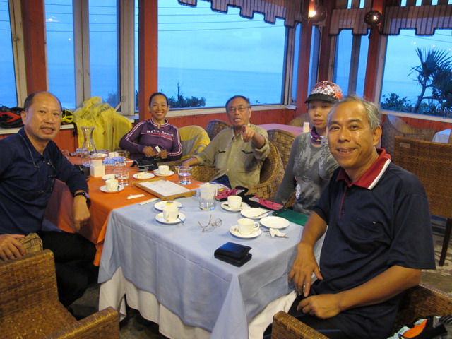 原先,凡事不願落人後的強人阿舍,每回想起昔日黃金歲月,無不意氣風發,然而,一得意就忘了成員中還有像Mike和邱公這等人物的存在。根據他的實力,他評估,每天行車的距離應該可以在100公里左右。但無奈,殘酷的歲月不饒人,當他再回首瞧瞧這幾個東倒西歪、老眼昏花、髮蒼蒼、牙齒動搖的老騎士,他只有嘆息,無奈地一再下修目標。最後,妥協的結果是每天以80公里為上限。從此,這次花東之行就被界定為豪華老人團:沿途以欣賞風景、享受美食、泡湯為目標的輕鬆、休閒之旅,尤其泡湯是阿舍指定每日之必要。