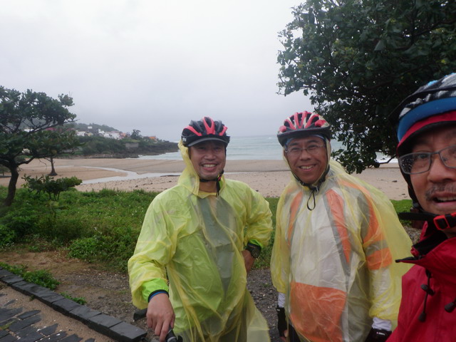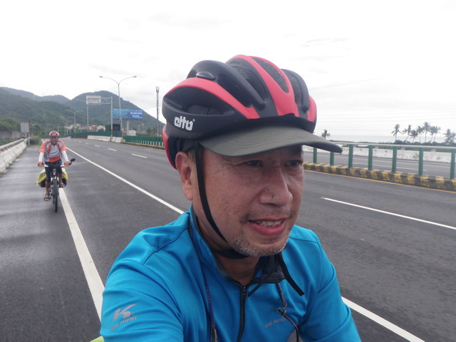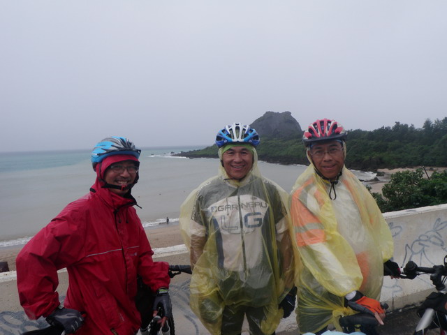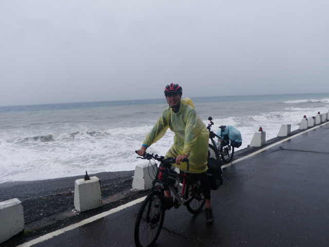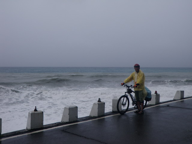 在過去幾天,Eric曾有幾次要我幫他拍幾張以海天為背景的個人照,作為初次體驗單車旅行的紀念,但我都自以為是的對他說:「不急、不急,到墾丁之後再拍,會更加出色!」而加以推延。看來我是錯得離譜。說真的,此次旅行,除了東部海岸的風景之外,我的確非常嚮往墾丁國家公園那些沿著海岸線的碧海藍天以及充滿南國風情的海灘、椰子林以及海浪拍打礁石濺起層層白浪的美麗風光,希望在這一路上能拍到許多藍天白雲白沙灘的美麗照片,但如今這一切確定淪為泡影。想到這,我就像洩了氣的皮球,提不起勁。少了攝影拍照的動機,卻要冒著風雨騎完未了的行程,於我,似乎不太情願,還不如早早回家。