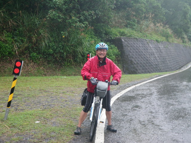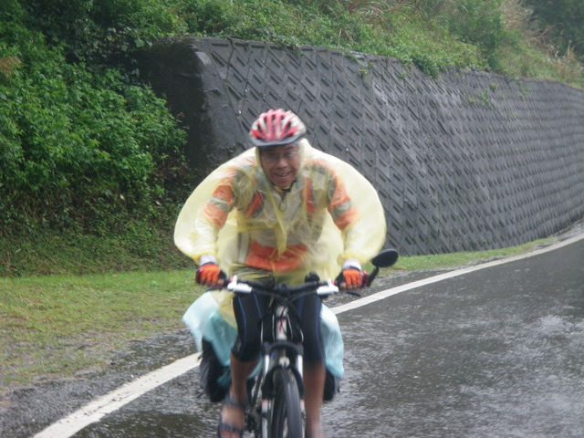 在一個小坡的轉彎處,Eric拿著他那部防水的傻瓜相機為每一位騎上來的人拍照,在這種氣候之下只能靠它了,我的單眼相機(擱在單車手把前的相機包裡)根本拿不出來。(Eric提供)