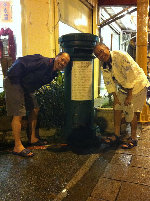 「旅行公寓」就位在恆春老街上,雖然心中有一大堆的哀怨,但飯還是得吃。恆春街上最有名的小吃就是「鴨肉冬粉」,而且就在旅店附近,走路只要5分鐘。切一大盤鴨肉,切一大盤的滷味,有豆干、海帶、滷蛋、鴨肫、鴨翅,四碗湯麵再加上浩苓自隔壁攤叫來的兩大盤炒飯,四個人如餓虎一般,吃得盤底朝天有如秋風掃落葉,可惜,這家小店不賣酒,否則,再來上一小杯,豈不痛快?吃完飯,沿著老街散步,看到這個郵筒才驚覺我們身在電影「海角七號」的拍攝地點。看這兩個老頑童,一付童心未泯的樣子。附近應該還可以找到什麼「阿嘉上班的郵局」、「阿嘉的家」、「水蛙幫忙送信的地方」等等看到這個郵筒才驚覺我們身在電影場景,但我們只想找個水果攤。