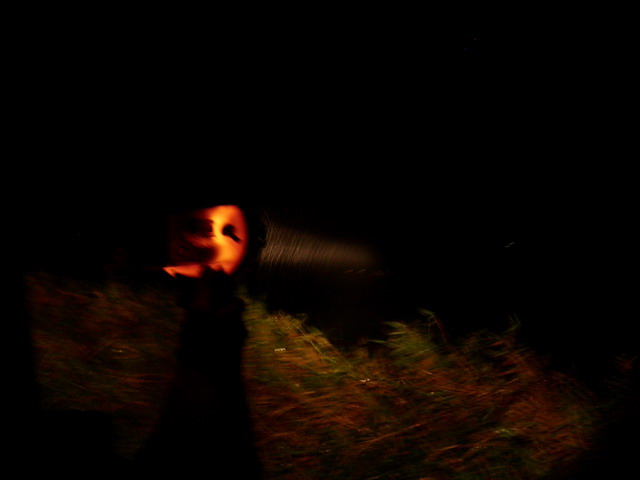 阿舍扭開探照燈,車外一片漆黑有如黑布幔籠罩的世界。一道白色的激光直直的射向遠方,特別顯眼。順著光束望去,光束停在遠端深不可測的黑暗樹叢裡。暗夜,有如一團黑洞將所有的光線盡數吸納於無聲無息,光束射抵那樹叢邊緣已是如此的柔弱無力。陳老板催問大家:「看到沒?看到沒?」坐在後座的我,從阿舍的背後望出窗外,睜大雙眼極力搜索,但除了綿密的雨絲穿過光束所產生的閃爍不定的反射光影之外什麼都看不到。阿舍持燈上下左右的搜尋,光束也在樹叢、曠野裡上下左右的擺動,但依舊一無所獲。我垂下頭看也只能矇矓的看到近處地上一叢叢低矮的牧草在疾風中激烈晃動黑色的身影。