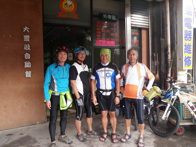 中午前,在風雨之中騎了將近30公里,大伙決定在滿州村解決午餐。村子裡有個小圓環,圓環旁有家小吃店。(Eric提供)