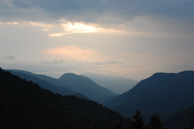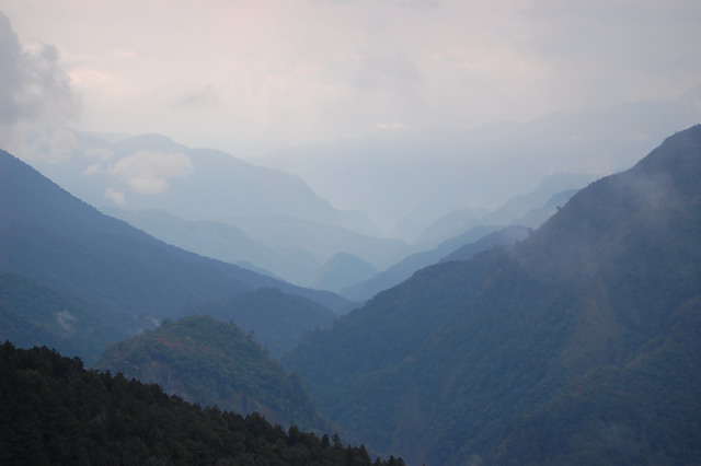 過了這11.5公里處的高點後,開始連續4.5公里的下滑,像迴紋針一般曲折的下坡道又急又陡,輪子的轉速飛快,伙伴們紛紛相互提醒要格外小心。在急速下滑的同時,我的心底暗暗地叫苦,我明白此刻的急下坡待會回程時鐵定是要付出重大代價的。在享受衝刺快感的同時,眼前的景觀起了變化:霧濃了,眼前如蒙上一層薄紗,遠山、近樹都變得迷離飄渺。