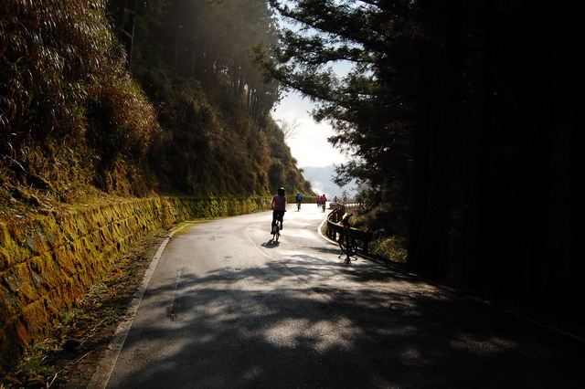 騎在林道中除了溫度舒適之外,迎面而來徐徐的清風更令人心曠神怡,四周青翠的綠意,不時點綴著一株一株盛開的櫻花,鮮紅的、粉嫩的,美不勝作,不禁讓我懷疑此時我所大口大口吸入肺裡的清爽空氣,應該都是山中的靈氣!