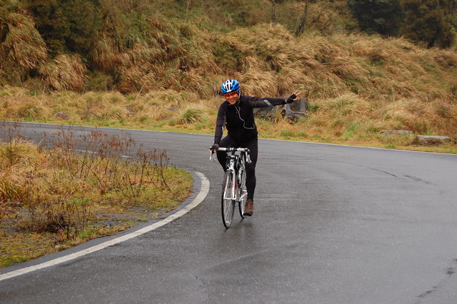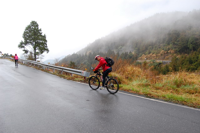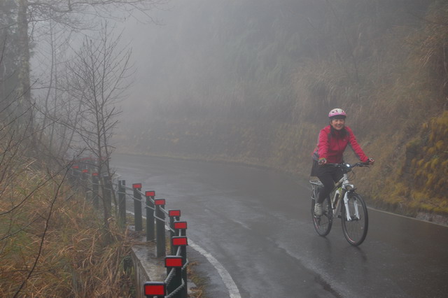 騎過坡頂,開始下滑,路上霧氣更是濃厚,週遭白茫茫地,能見度約剩下五至十公尺。在霧中行車,彷彿與世隔絕,又似乎凌虛御風而行,除了輪胎擦地,我聽不到別的聲音,除了自己,我看不到其它人,我必須專注的看著前方,深怕撞上霧裡突然出現的來車。由於是連續下坡的緣故,車速極劇加快,細雨撲面,迎面而來的刺骨寒風叫我牙齒不住的打顫,這才猛然發現自己身上的衣著不夠,只能靠雙腳不停的運動讓身體產生熱能才勉強挺住,但那僅有的一點熱度很快的又被寒風刮走。