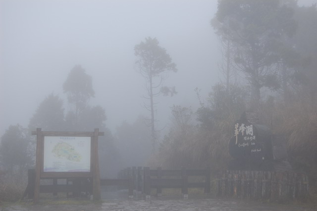 下到谷底,來到翠峰湖環山步道入口處的休憩亭,霧實在濃得化不開,近在呎尺的人物都難以分辨,看樣子,此刻的翠峰湖應該是隱藏在蒼茫的濃霧裡,這麼一來,我們根本用不著去找尋那記憶中如夢如幻的翠峰湖了!