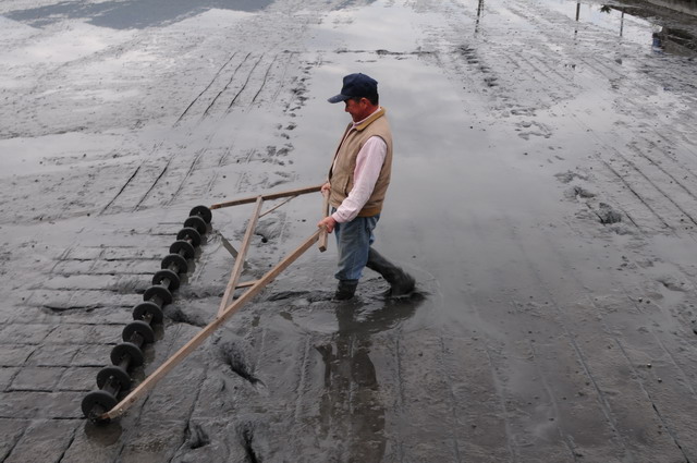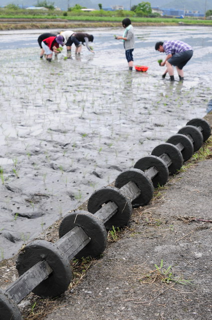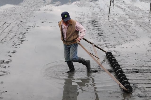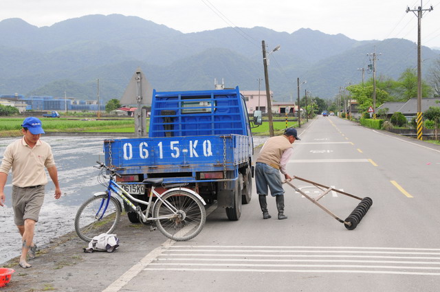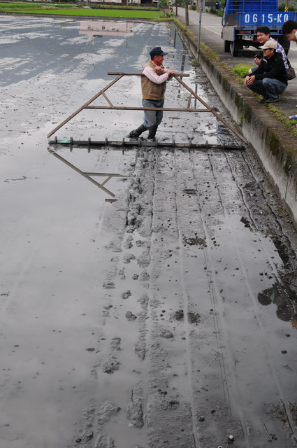 我不知道現代的機械化插秧是用什麼方法來維持筆直的稻秧線,但今天,這位老農師傅特地為大家帶來一具據他指稱是由日本人設計,且已經十分古老的手插秧拉線的輔助設備。他拽著這器具在水田中垃線,先為大家刻劃出插秧的經緯線。