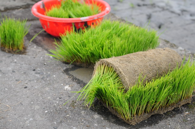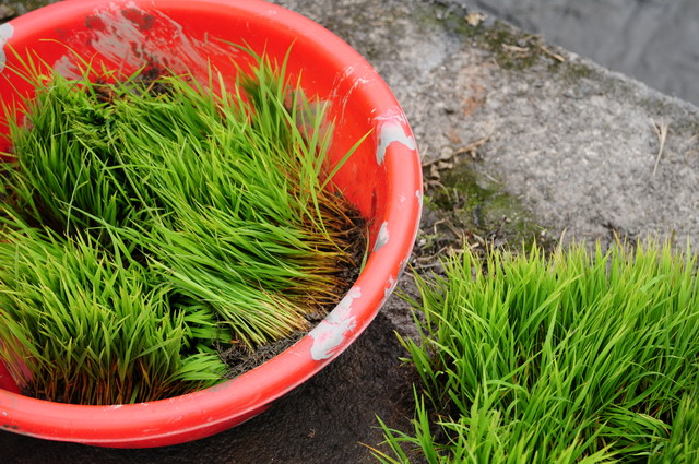 剛從苗床裁移過來的秧苗。整捆捲好的苗床露出青翠的苗尖兒,好像一截令人垂涎的牛肉蔥卷,Yammy!