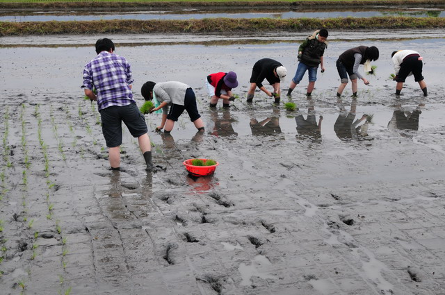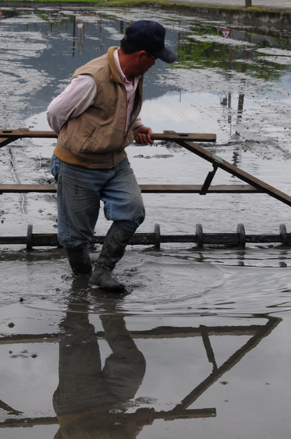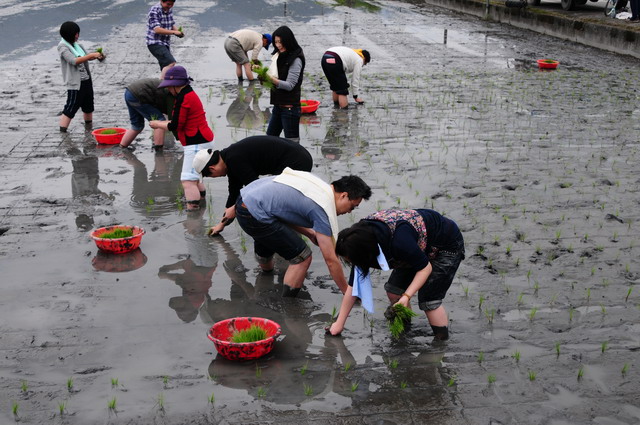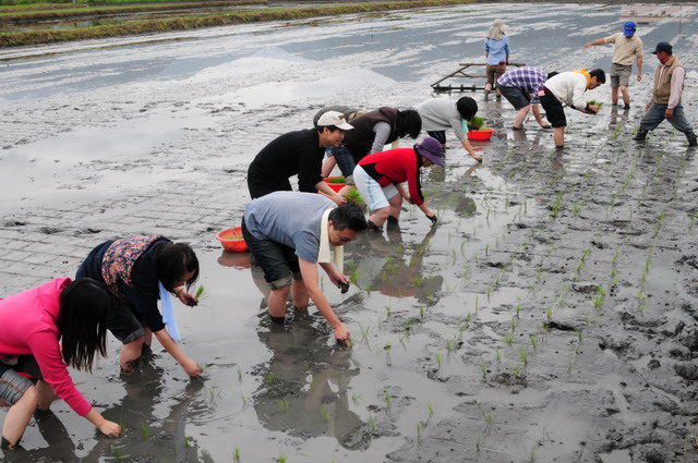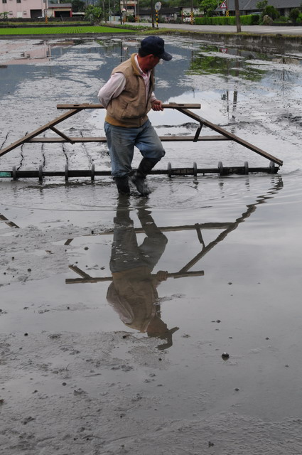 插秧之前,先要整地,將稻田的土壤翻過,使其鬆軟,再注入渠水,以利水稻根系的生長。以前,多半利用水牛來犁田整地,但隨著時代進步以及農村人力短缺,現在多半利用機器整地。這塊今天準備用來插秧的田地,看來萬事都已事先準備就緒,就等我們下田。