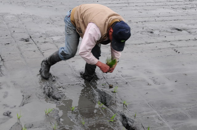 只見他左手握著一大把秧苗,右手很熟練地自左手戳出一束,拇指靠前一點,其他四指併攏,便將秧苗穩穩地插到水田裡。每一束都需要插在準確的位置、適當的高度。