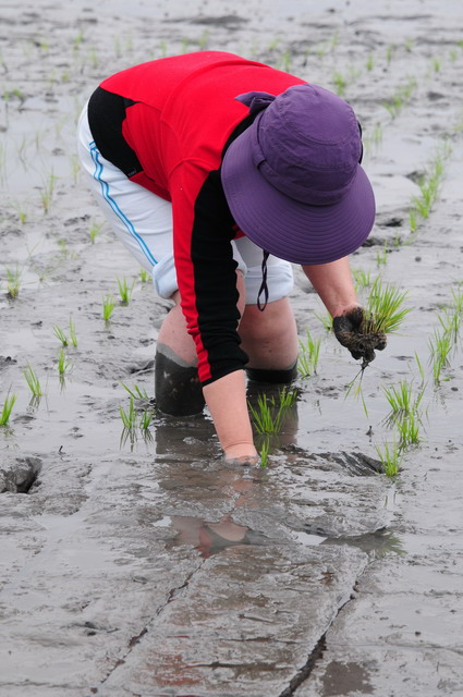 老農師傅不時的在一旁指導眾人插秧的動作。插好一橫排,後退一小步再插一橫排,一直到插滿為止。