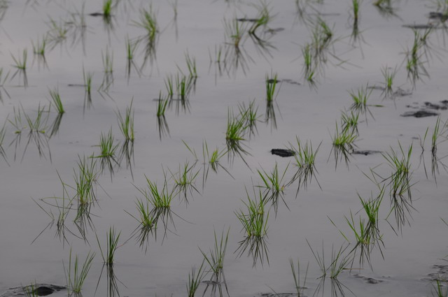 那一大片被田埂分割成一方一方的水田,一年四季裡有著不同的風景。春天,翻過土、灌足了水,水田就成了一面大鏡子,天邊火紅的夕陽常常上下各有一個;插秧之後,沒多久就可看到農人頂著大太陽,三三兩兩的匍匐在水田裡除草、整地;隨著稻秧的成長,水田的四周經常可以見到白鷺鷥和烏秋的身影,不是從水田上空飛掠而過就是停歇在田埂旁的電線桿上;當稻秧長至腳踝的高度時,水田就成了我的遊樂場,沿著田埂我抓蝌蚪、釣青蛙,這時候大人們最愛嘮叨我,一再警告,可別被蛇給咬了;待稻子開花抽穗,穗子越來越重,重得叫稻子彎腰,稻田也從綠色慢慢的翻轉為金黃的海浪,這時候喧囂的麻雀不知從那裡聚集過來,不是一隻兩隻而是成群結隊3、40隻,從田的這一頭突然爆飛而起又呼嘯地飛到田的另一頭,農人收割打穀時更是囂張的相互爭食因割稻而被驚嚇四散的蝗蟲蚱蜢;待稻子收割完後,稻田裡只剩下紮束成堆的稻桿豎立在地面上,這時候,孩子們三五成群的在田地上放風箏,五顏六色的風箏在空中伴隨著一縷一縷的濃煙,原來,乾涸了的田地正好拿來焢窯烤蕃薯。