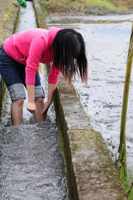 田邊有條溝渠,溝內水量充沛,工作完後大家不約而同的下到水溝沖洗手足。但沒想到的是田裡的泥竟是由非常細微的粉末所組成,溝水只能洗掉皮膚上的泥污,手腳指間的縫隙卻怎麼洗都洗不清。