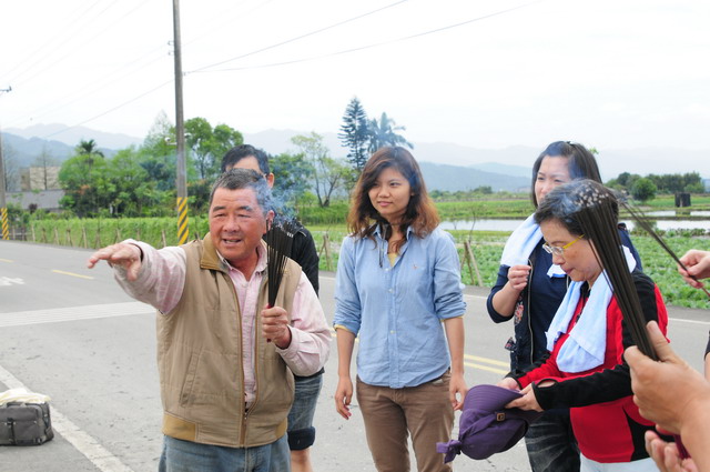 每個人手持清香一柱,由老農師傅帶領大家向上天、向土地公祈求風調雨順,收成好。
