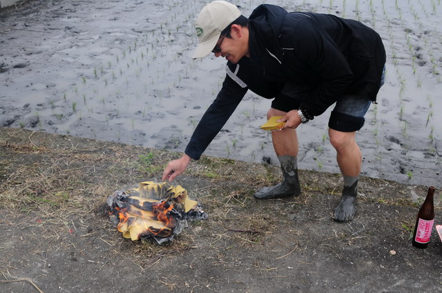 永豐餘生技農場的場長,維垣,今天來到他的地盤,受他照顧良多。趁著他在燒金紙時我向場長請教,今天我們種下去的稻種是什麼品種?他說和去年一樣是“秈十”種。