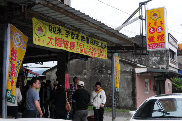 中午先在冬山鄉的“一佳村田媽媽”餐廳吃午飯,吃過午飯再回三星,原來老農聰榮伯他採取多角化經營,你瞧,他家門口旗幟鮮明,同一幅“老農夫”臉孔的logo既是朱聰榮「老農米」的標誌也可做為他太太黃寶珠「大隱做粿」的商標。