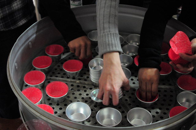 經簡單的說明後就開始動手,先做發糕。先把大小模具擺進蒸籠裡,再鋪上墊紙……