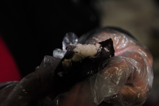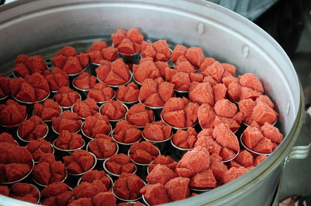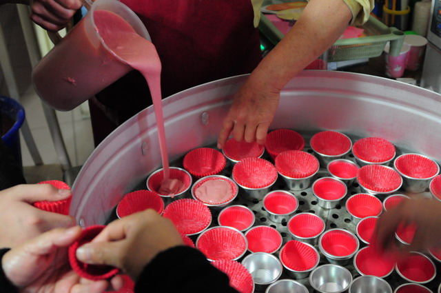 粗布袋集好了米漿之後,將布袋口用麻繩束緊,擱在長條板凳上夾上扁擔將袋內的漿水壓搾濾乾,如此壓著往往要經過一天一夜直到袋內的水分完全被擠乾。接下來才是硬活,媽媽要將乾凝成硬塊的米漿揉開成粉狀,摻入紅糖(或黑糖)再揉,一直揉到顆顆糖粒都均勻地融入米粉裡,最後,原來乾硬的粉塊又再變成黏人手指的漿狀。我還清晰記得媽媽在一搓一揉之中,她額頭上豆大的汗珠。等待年糕蒸出爐更是小孩的期待,爐上的大鍋冒著蒸氣,時間差不多了,媽媽會不時的掀起蒸籠蓋,用手指探探年糕的熟度。最後,起鍋,一籠一籠的年糕端上桌冷卻,但顧不得燙死人的熱度,圍觀的弟妹們總迫不及待的趁媽媽不注意的當下偷偷用手指摳一塊又疾疾地送進饞極了的嘴巴裡…。啊~~~,這些早己塵封的記憶。