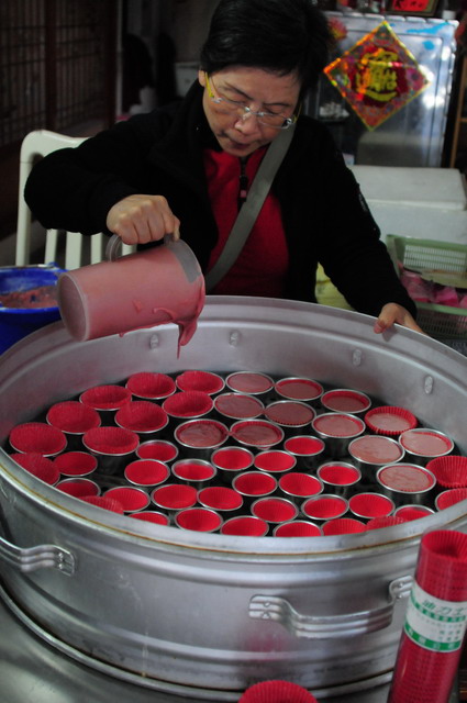 由寶珠女士示範,如何把已磨好的米漿倒入模具內……
