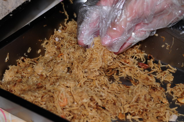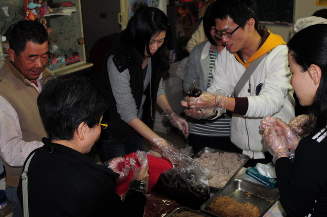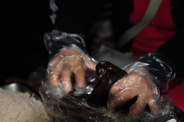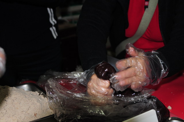 當發糕拿到後面廚房去蒸的同時大家來動手包粿。寶珠女士說:「我的粿全用傳統的做法。只是古早人做『紅龜粿』用的『紅朱膏』,我改用紅麴來代替。」她說她的紅麴會固定在一家中藥店採購,任何前來家門口推銷的她都不會動心。寶珠女士又說由他們自家生產出來的老農米所做出的粿最是Q口,她說:「我曾經試用其他的米來做,但都不滿意。」她還說,算好了要做多少粿才碾多少米,絕對新鮮。她指著桌上兩大坨的粿皮說:「紅色是紅麴、綠色是刺殼。所有的材料全部天然,不加色素不加任何人工添加物。」粿皮固然好吃,內餡也輕忽不得。為了掌握口味,內餡都得自己炒,不會去買現成的。今天擺在桌上二大盤的餡是:菜脯米及大紅豆泥。
