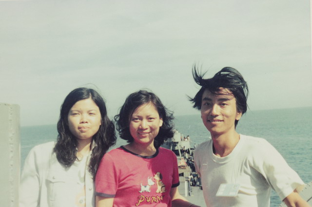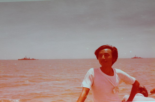 那時候,全體學員在褥熱的七月天到高雄港報到、集合,本該報到的當夜就該啟航的,卻在登船的前一天拉起了颱風警報,我們在高雄港整整多待了二天。等到警報解除可以出港來到海上時我己經沒有外衣可以換穿了,成天穿著一件汗臭的BVD在船上亂竄四處結交朋友。