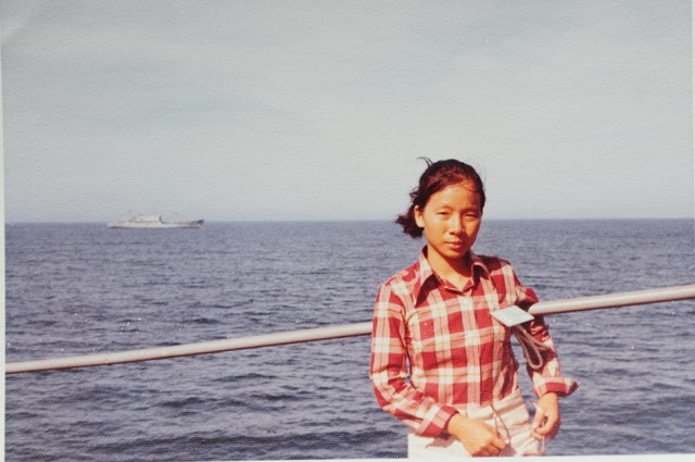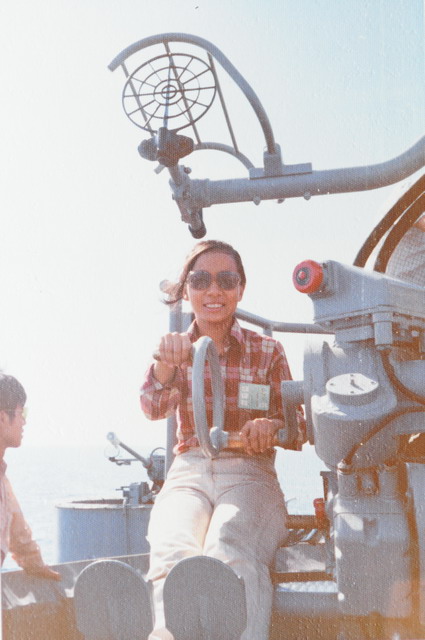 這是當年的麗真,她照這張相時我猜我還不認識她,我和她來自不同的學校。這時刻,她靠在這一邊的船舷,而我,或許就在另一邊的船舷,但可以確定的是,倆人正接近中……。