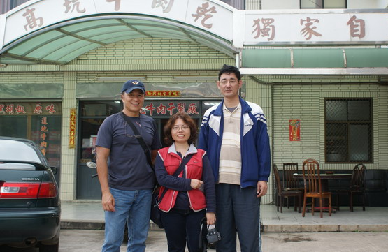 大魏站在她大哥和阿舍之間。攝於高坑牛肉店前,那一夜我們享用了高坑的“半牛”大餐。(阿舍提供)